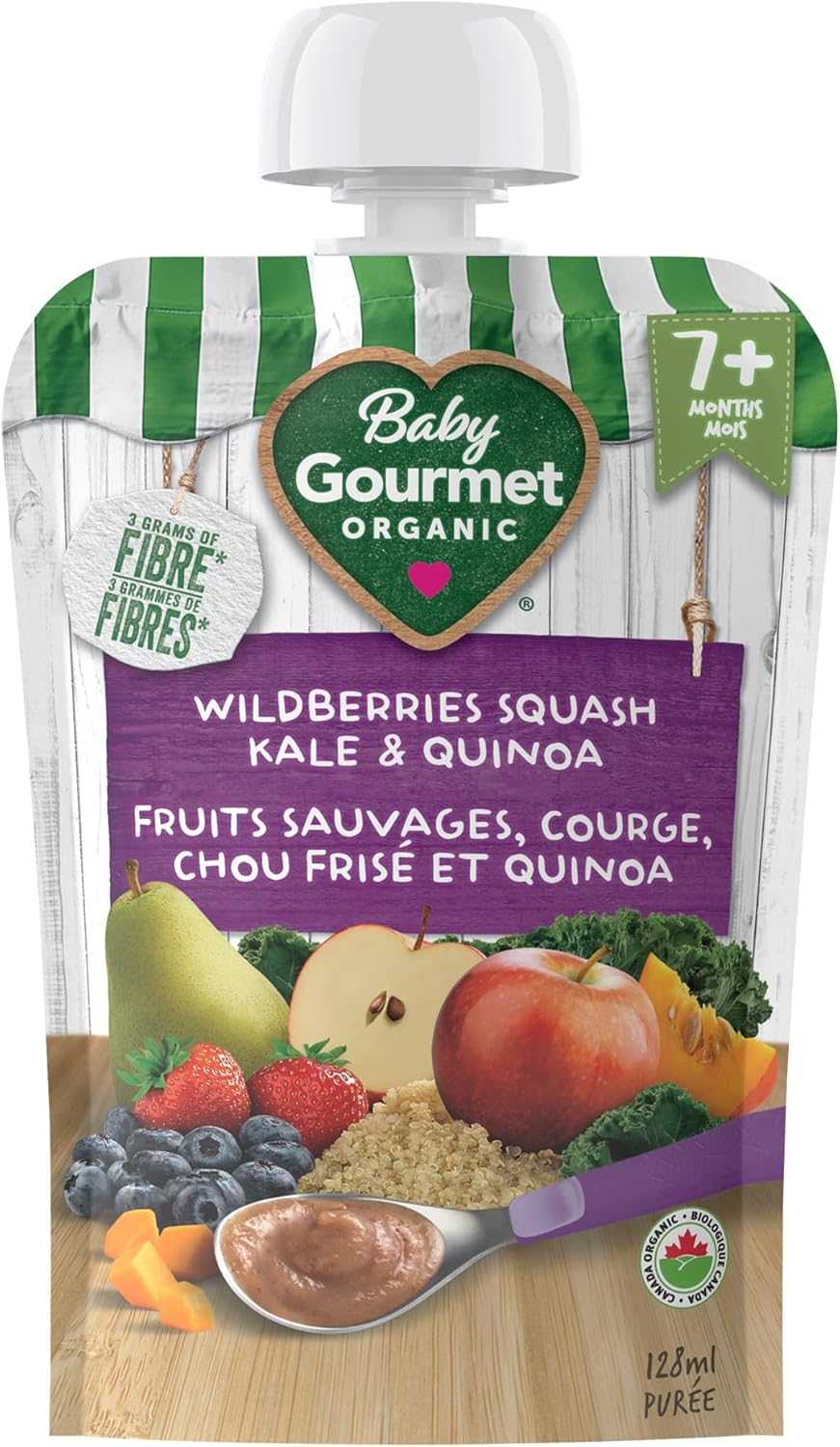 Baby Gourmet’s organic Plus purees are made for little ones’ 7 months and beyond. This organic baby puree is a creative and healthy version of berry crumble made with blueberries, strawberry, apple, pear, butternut squash, quinoa, kale and a hint of vanilla and cinnamon.This fruit and veggie puree provides a source of iron and 3 grams of fibre. Baby Gourmet does not add artificial ingredients, salt, or sugar to their organic baby purees. This pouch package allows for baby to hold and squeeze by themselves or for the pouch to be squeezed directly onto a spoon for mess-free eating.