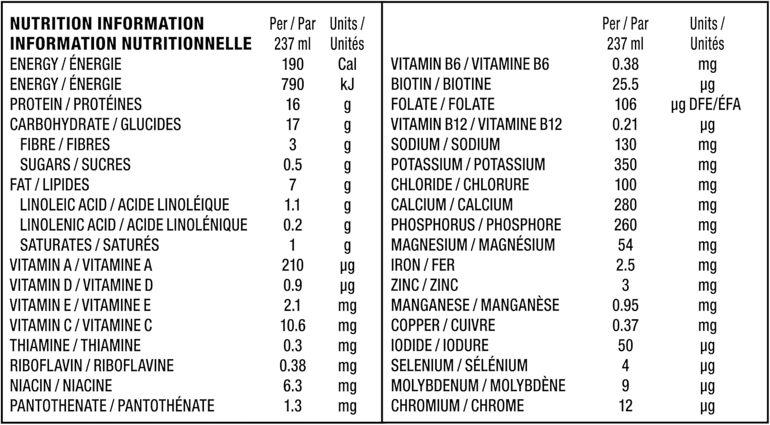 Contains 16 g of protein, 0.5 g of sugar, 3 g of fibre and 17 g of carbohydrates per 237 ml to help provide a source of energy