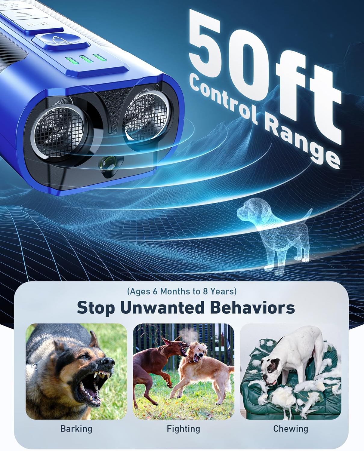 【Upgraded 2X Ultrasonic Tech】: Our dog barking silencer, this bark deterrent device, uses dual emitters to deliver 5X wider coverage (50ft) compared to bark collars, stopping aggression/barking instantly. Pain-free ultrasonic waves replace dog shock/spray collars—no choking, chemicals, or contact required. Safe for dogs and humans.