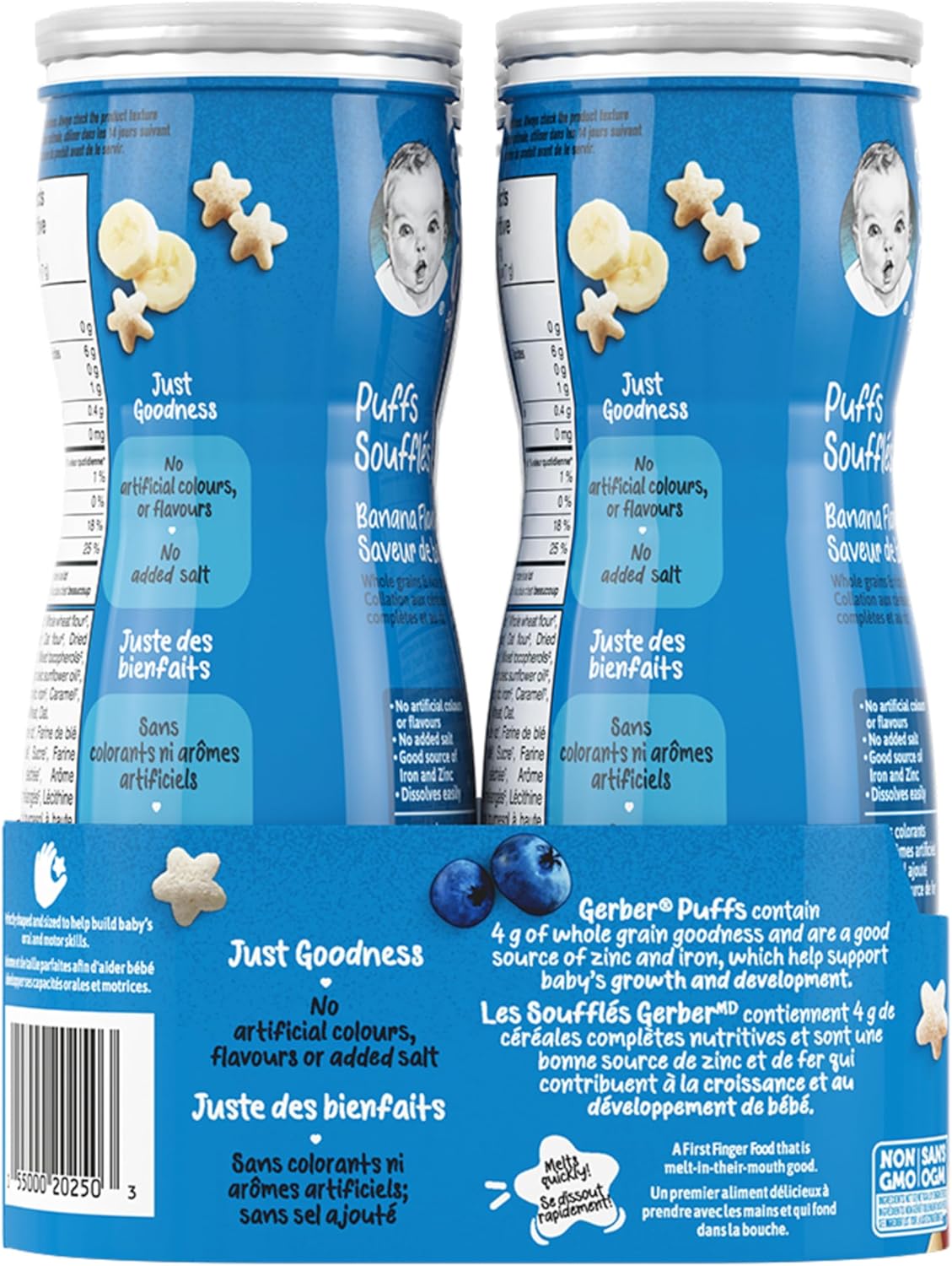 Make GERBER Puffs baby’s first snack! Developed to be wholesome and delicious, these snacks for babies 8 months and older are star-shaped, perfect to help build baby’s oral and fine motor skills, and dissolve easily. This variety pack includes two canisters each of three delicious flavours — Banana, Strawberry Apple, and Blueberry Vanilla. A healthy snack, GERBER Puffs are made from non-GMO ingredients like puffed cereal grains and real apples and have no artificial colours and no artificial flavours. Each serving contains 4g of whole grains and is a good source of iron and zinc, which help support baby’s growth and development. Perfect for baby’s snack time at home, our convenient reclosable canisters also make it easy to take baby’s favourite snack with you wherever you go. Just slip one in your bag and you’re off! GERBER Puffs, made with your little one in mind.