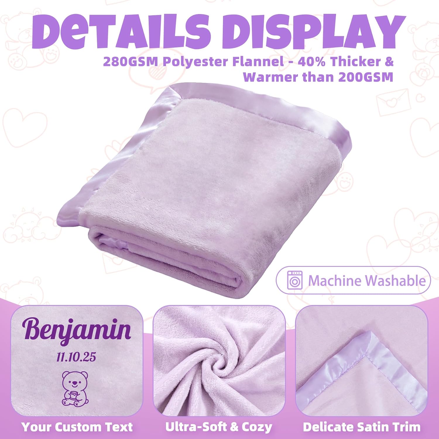 Size & Material & Color: 40″x40″ (100x100cm) generously sized blanket, crafted from premium 280GSM high-density flannel for exceptional softness and cozy warmth. Available in soothing shades of blue, pink, and purple to effortlessly complement any nursery style.