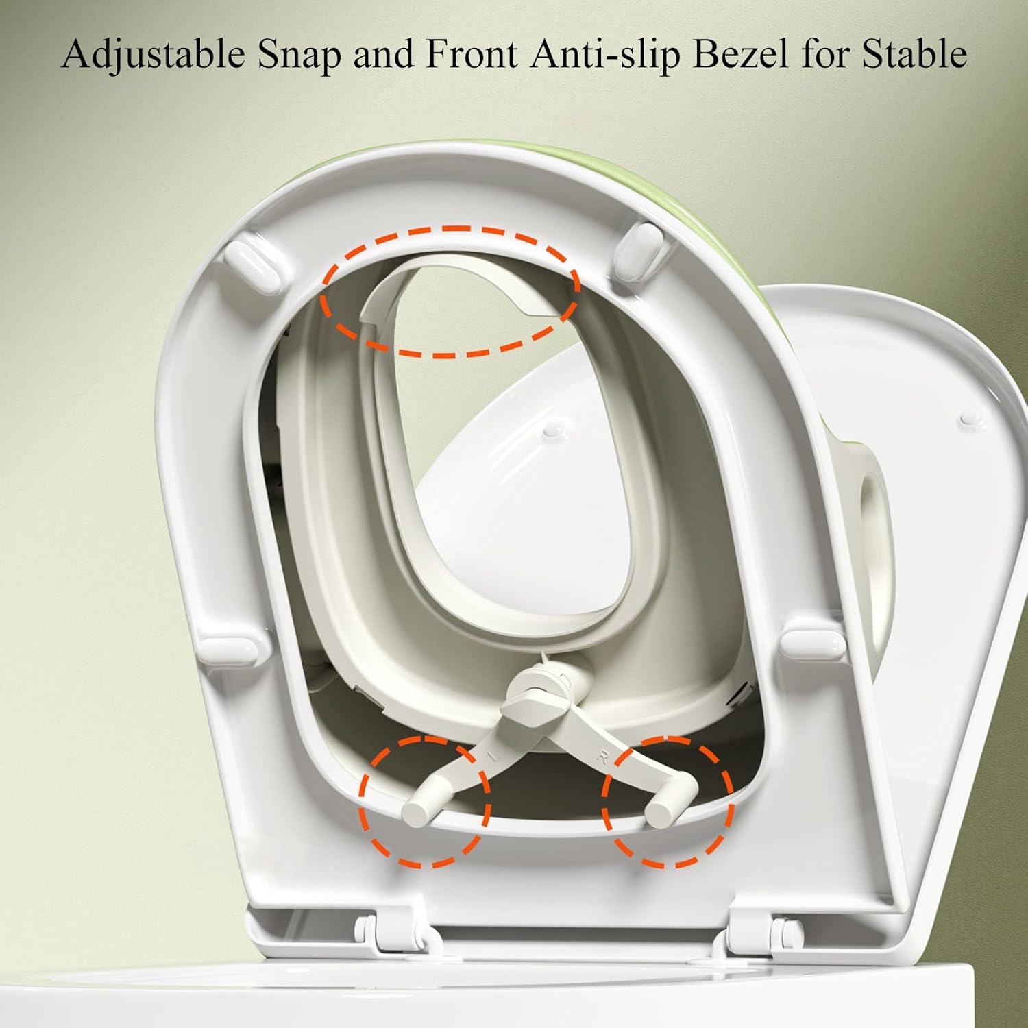 Safe and Stable: This potty training toilet seat features with adjustable snap and front anti-slip bezel, which keep the toilet training seat securely in place. And the smooth handles offer additional security which makes your kid feel safe while learning how to use the bathroom.