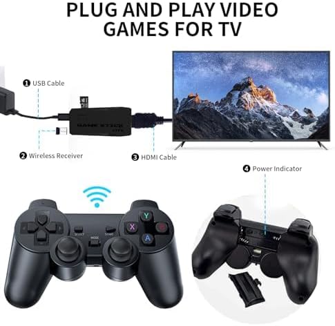 Plug & Play Retro Game Console Stick: Getting started is simple and straightforward: connect the games console to a power source, plug it into your TV, and select the HD channel to access the game menu. Here’s how: 1. Insert it to the HDMI port of your TV 2. Confirm the TF card is installed and insert the wireless receiver to the gamestick. 3. Plug in the power adapter adjust your tv modes to HDMI 1 or 2 and enjoy endless classic gaming fun via our retro gaming console.