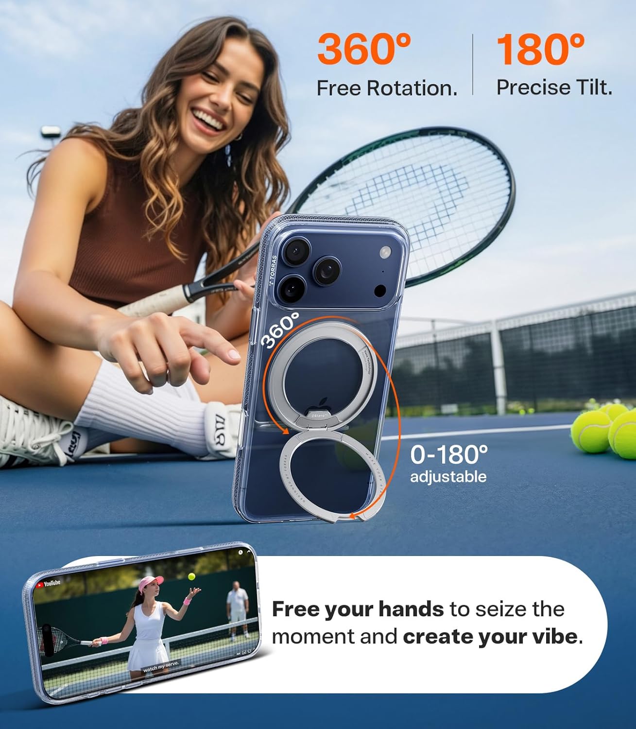 [The Original 360° Magnetic Stand — Redefining Hands-Free Freedom] As the inventor of the 360° magnetic stand case, TORRAS redefines versatility for iPhone 17 Pro Max. Stand vertical for FaceTime calls. Flip horizontal to capture group photos. Tilt 45° for hands-free cooking recipe scans. Each rotation delivers a satisfying, Swiss-engineered click — that signature sound of precision. Ostand O3 Fitness Series frees your hands to create, share, and live.